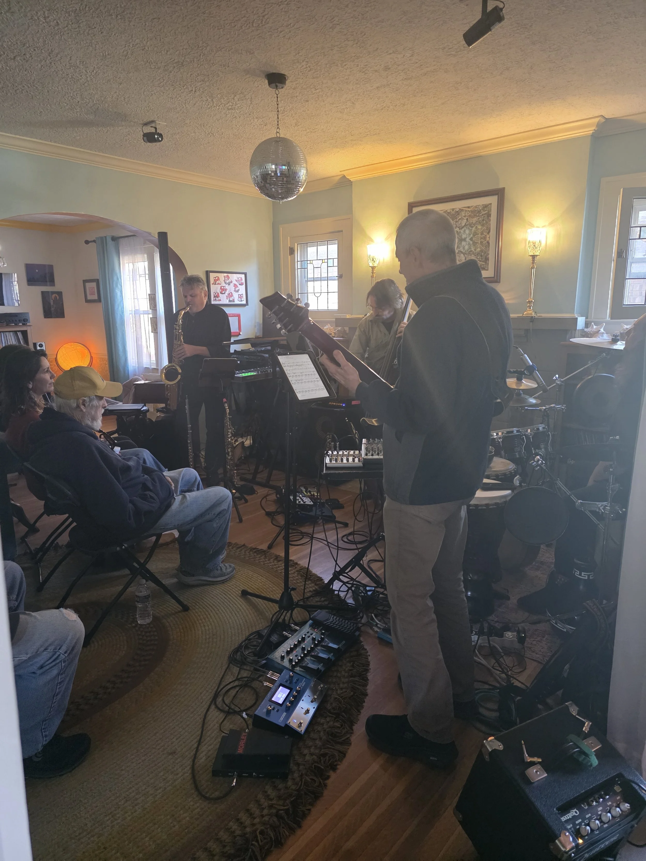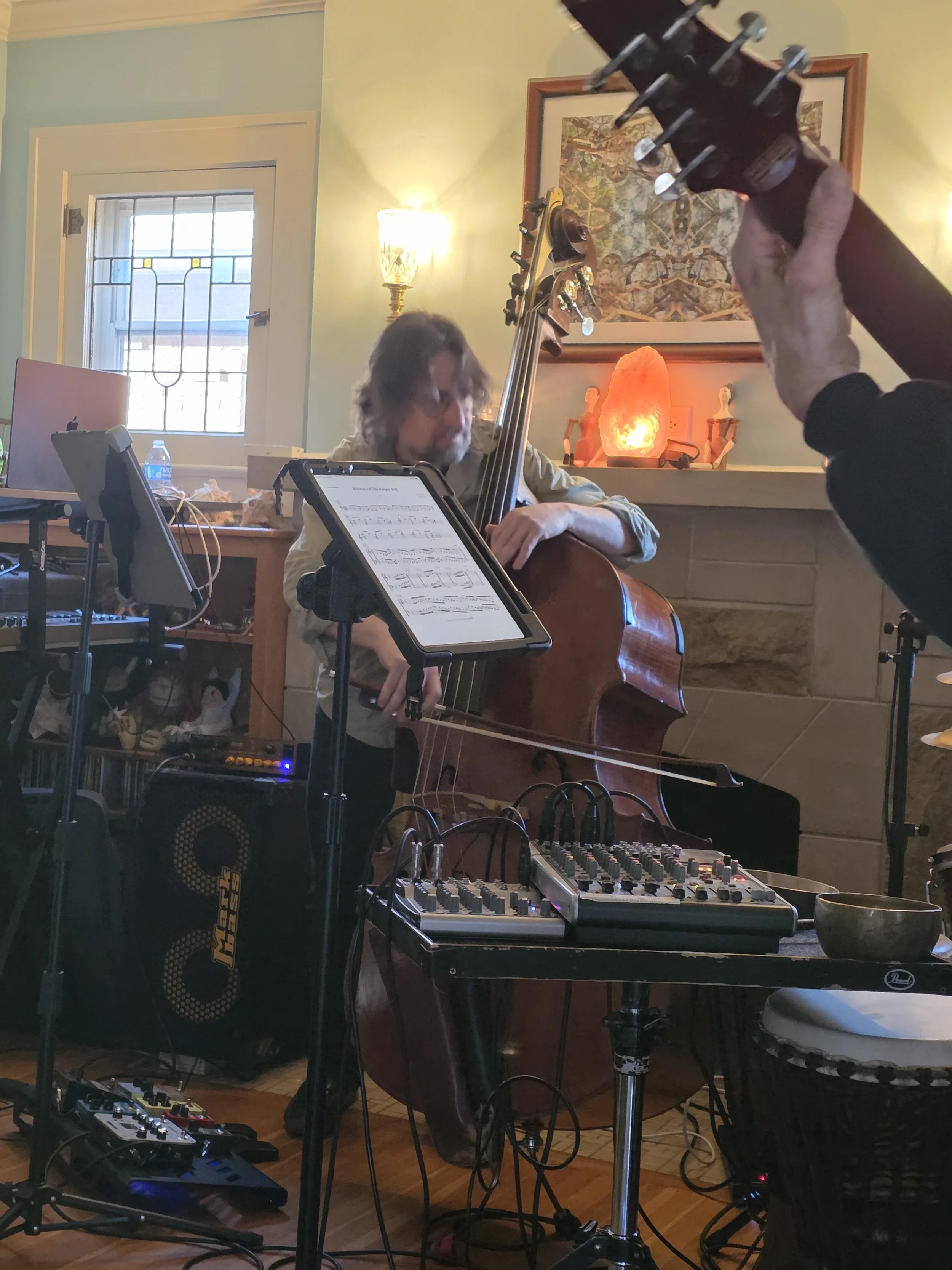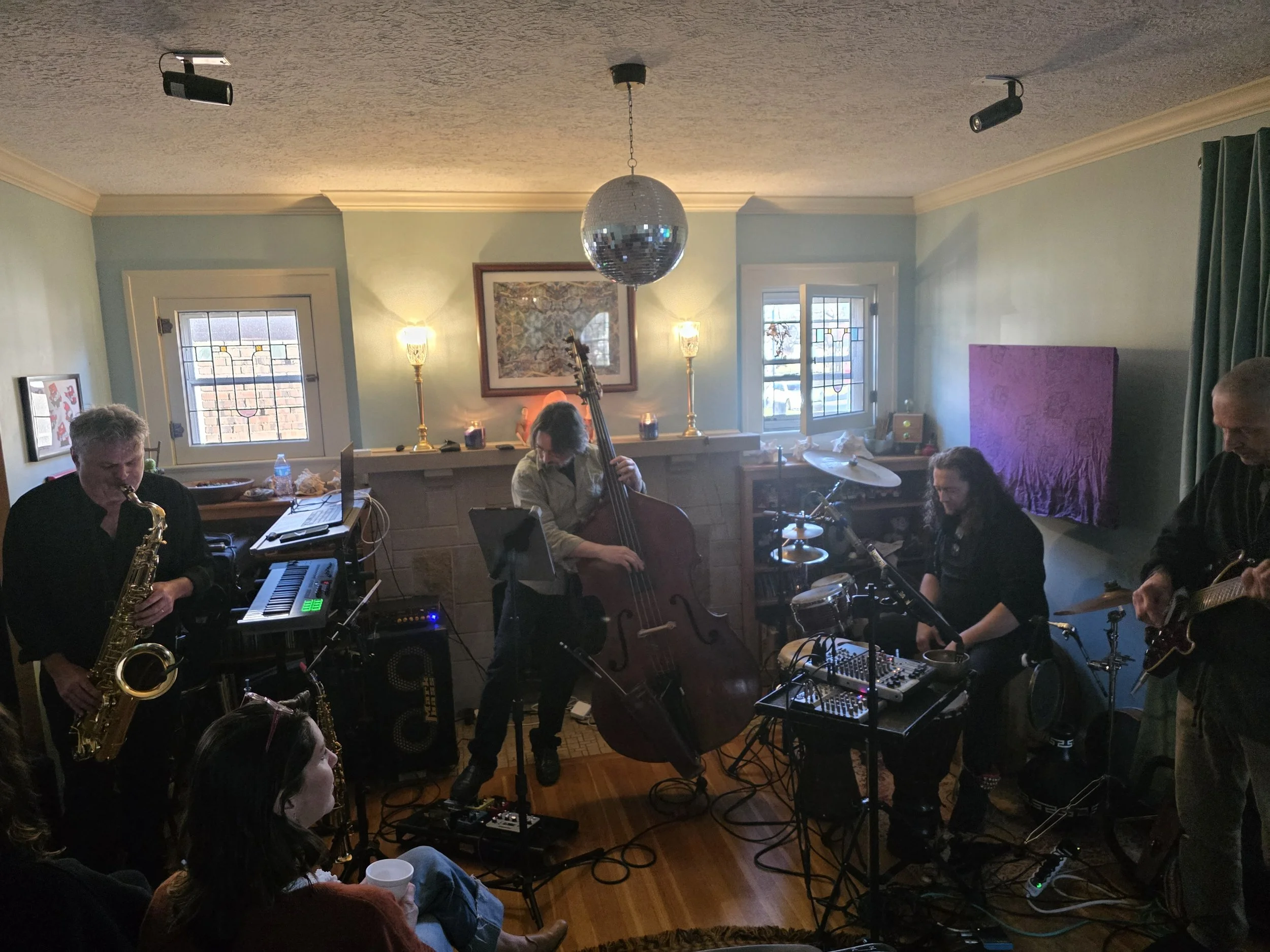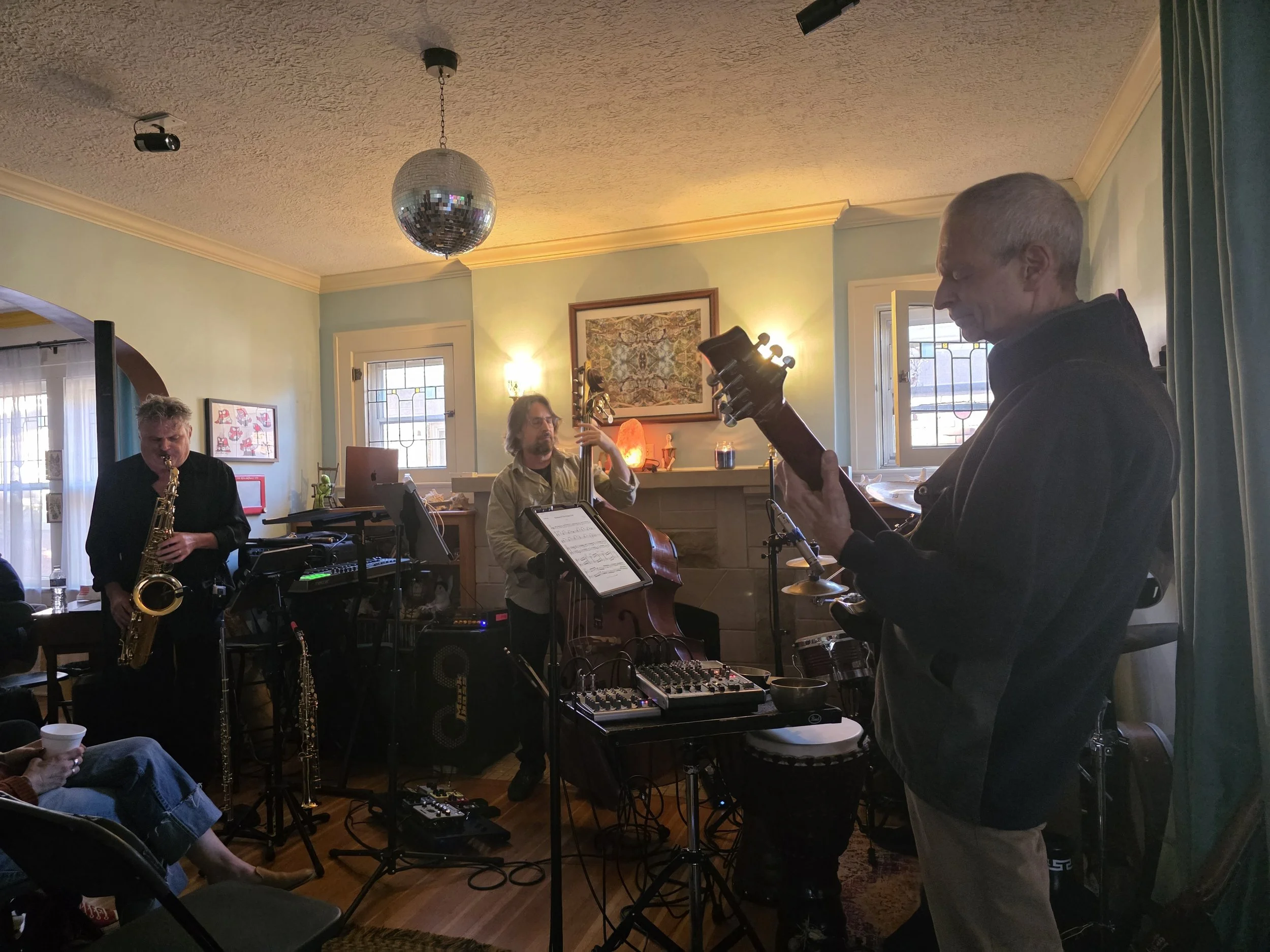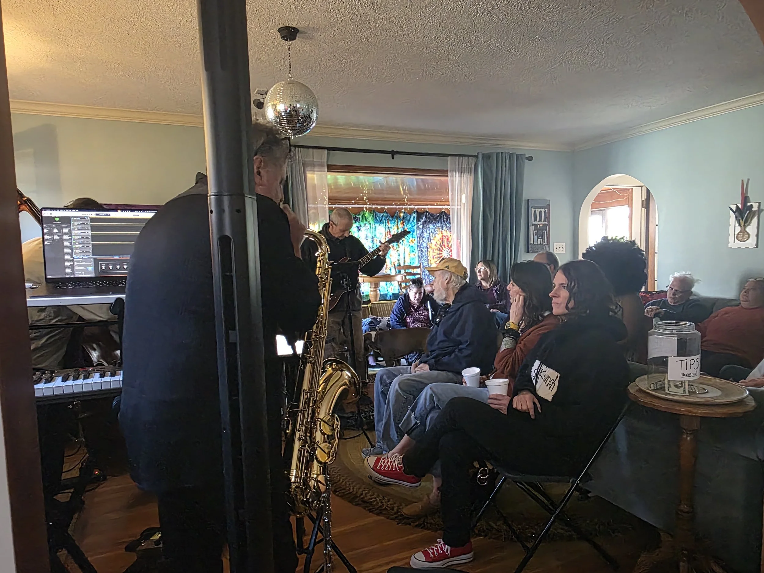 Multi-instrumentalist Tom Clark was actually the first musician to arrive that day, showing up early to set up his extensive gear. His station included a keyboard, computer, and several pieces of equipment that created a wide range of sounds. Tom also managed much of the group’s sound during the evening while performing, layering textures and even looping his own parts during one of the tunes. The reason he arrived so early? He had to leave to play a fundraiser gig before heading back over for the house concert and wanted to be all set up. House concert guests were lucky he was able to fit two performances into one day and still bring so much energy to the room. Hearing him play both flute and saxophone was added so much to the experience.